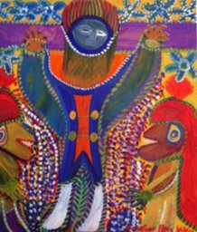 Des centaines de dessins, gouaches, peintures, collages... empliront les sept années au cours desquelles il peint sa vie, ses enfants, son entourage, achète la télévision pour "raconter" le monde ! Une oeuvre belle, volubile, trouvant très vite une unité de style (sans que le peintre ait conscience de ce mot !) Un univers pictural composé de personnages toujours placés de face, comme regardant le spectateur ; riant de toutes leurs grandes dents, même si parfois le rire se fige parmi les "rides" ; mais surtout, entourés de fleurs, de fleurs et de pointillés, de fleurs et d'une multitude de tirets... de fleurs comme cernant ici un couple, lui coiffé d'un martial képi, elle d'une opulente chevelure ; là une Duchesse, à la robe éventail, au minuscule visage surmonté d'une tiare démesurée... Ailleurs, un à la chevelure circulaire, aux gros yeux en amande ; les élèves de L'Ecole Saint-Jacques en cravate et au corps monobloc sanglé dans des costumes à rayures... de Grandes danseuses, raidement au garde-à-vous telles de gentils soldats de plomb, parmi les plantes et les fleurs ocellées comme des plumes de paons, au point de donner l'impression que ce sont elles qui dansent ; et que créateur et création en soient tout illuminés ! Cycle après cycle, se déroulent, comme un leit-motiv, les Très Riches Heures d'Anselme Boix-Vives, stupéfiantes par les rebondissements de cette vie utopique, embellies par la création ! A sa mort, une presse abondante rend hommage au "grand peintre autodidacte Boix-Vives" ; et il y "a plus de fleurs sur sa tombe qu'il n'y en avait dans ses tableaux ! Ce qui semble impossible !