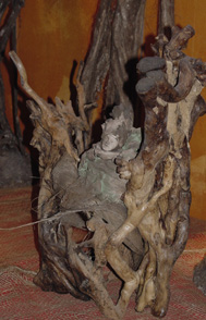Mais le plus inattendu survient lorsque l'artiste veut socialiser ses personnages : Les appuyant en groupe sur un unique pseudopode, les longues tresses similaires de leurs cheveux redescendant vers les troncs-corps mimétiques, elle les ramifie en bouquet d'une exemplaire symétrie. Ce faisant, autre paradoxe, elle les situe dans une réalité qui supprime toute idée de généalogie. Les veut-elle alors à une étape d'existence végétative, très introvertie, d'où leurs fronts sans rides et leur éventuel amorce de sourire exclurait l'idée de la mort ; où la sérénité de leurs visages suggérerait même une avancée vers une vie ?