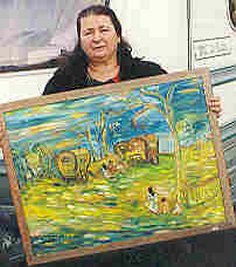 MONA : A 19 ans, quelqu'un m'a remarquée. C'était un colporteur. Je n'avais à cette époque-là que quelques tubes de peinture à l'eau, une boîte comme celles que les enfants emportaient à l'école. Je ne sais d'ailleurs plus d'où elle pouvait venir ? Un jour, ce colporteur est arrivé avec une boîte de belles peintures brillantes, de la peinture en tube. Il avait aussi une belle toile toute neuve. Il m'a demandé si je voulais lui faire un tableau ? Je lui ai peint un petit gitan qui avait le pied posé sur un tronc d'arbre, et quelques caravanes à l'arrière. Je le lui ai donné. Il m'a fait cadeau du matériel qu'il m'avait apporté. Si bien que j'ai continué à peindre avec. Je suis arrivée à la cinquantaine, et mon père a dû aller à l'hôpital. Alors, pendant les heures où je restais près de lui, je me distrayais en dessinant avec mes crayons. Une infirmière a remarqué ce que je dessinais. Elle est allée le dire à une dame de l'hôpital, qui est venue me voir, et m'a demandé si je voulais bien lui peindre un tableau. J'ai accepté. Elle me l'a acheté, à peu près le prix de la toile ! Elle m'en a demandé un deuxième, mais je le lui ai pratiquement donné, à part ce que j'avais payé pour le matériel, parce qu'elle était gentille et que cela me faisait plaisir que quelqu'un s'intéresse à ma peinture ! J'ai continué à peindre, des portraits surtout. Et puis, j'ai rencontré un docteur qui s'en allait à l'étranger. Je lui ai peint un homme. Mais là, j'ai eu un problème technique : Je voulais faire des reflets, mais je ne savais comment m'y prendre. Alors, j'ai carrément posé du blanc sur le nez, ce qui faisait un drôle d'effet !