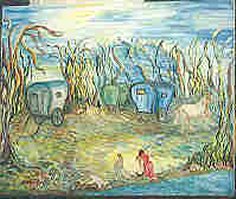 Remarque : Contrairement à l'impression produite, les rectangles sur les côtés des roulottes ne sont pas des fenêtres : chaque roulotte mesurait 1,50 de large. Or, les lits étaient placés en travers, donc bien trop courts pour les adultes. Alors, on pratiquait une ouverture et on fixait une boîte à l'extérieur de la roulotte, prolongeant ainsi le lit, et dans laquelle les pieds pouvaient dépasser, Cette boîte était appelée " boîte aux lettres " ! Mona ne connaissant pas la perspective, n'a pas su rendre le relief de ces boîtes !